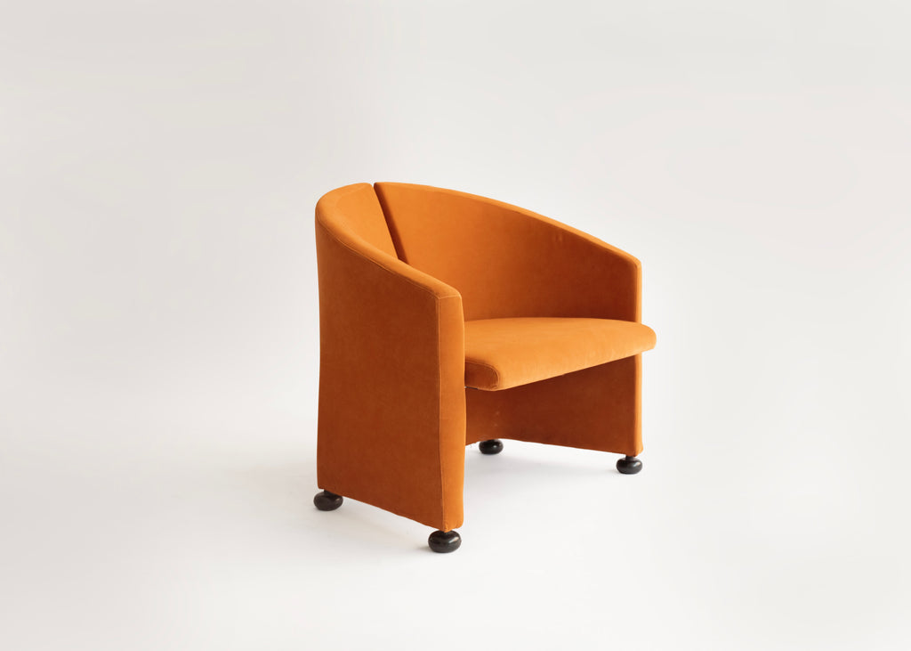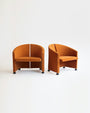 This iconic set of two armchairs, designed by Giovanni Offredi for Saporiti Italia in the late 1980s, is a striking example of postmodern Italian design. Each chair features a sculptural, curved back and a plush seat upholstered in a rich fabric. Resting on elegant casters, these armchairs offer both a unique, artistic aesthetic and practical functionality, making them a sophisticated and comfortable statement piece for any modern interior.
