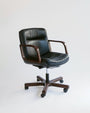 This vintage office chair from the 1970s is a superb example of Czech modernist design. It features a sleek wooden frame with integrated armrests and a comfortable, sculptural seat upholstered in rich black leather, making it a sophisticated and functional piece for any workspace.