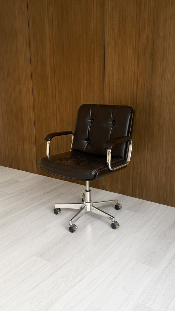 This vintage office chair from the 1970s is a stunning blend of classic design and functionality. Featuring rich brown tufted leather and a sleek chrome frame, this piece embodies timeless style. The comfortable sculptural form and rolling base make it a sophisticated and practical addition to any office or study.